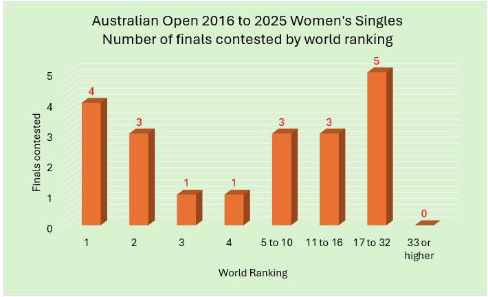 Earlier in the piece I discussed briefly the rankings of players that have gone on to make the Men’s final over the past ten years. Below is a graph showing the number of finals contested based on different ranking positions in the Women’s Singles: