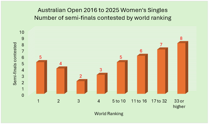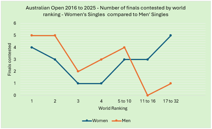 Graphs are often an excellent way to compare two data sets, and this one is no exception. There is a stark difference between the blue line (for the ladies), and the orange line (for the men). It clearly shows that in terms of finalists the men’s event has gone much more to ‘form’ / world ranking than the women’s event.