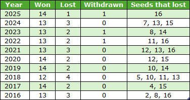 In terms of the top players, if we look at the top 16 seeds by year, here is their 1st Round record: