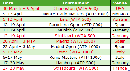 The main clay court tournaments (500 / 1000 events) with dates are shown in the table below. Men’s tournaments are in black, ladies in red.