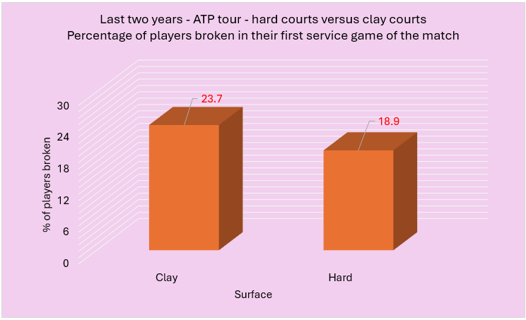 As the graph shows, more players lose their first service game of the match on clay compared to when playing on hard courts.