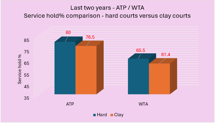 Male players have held serve 3.5% less often on clay than they have on hard in the last two years, women held on clay 4.1% less often.