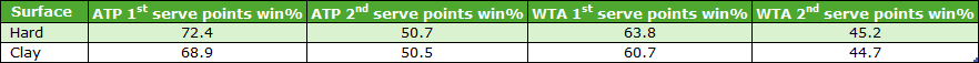 These stats are illuminating: in terms of points won on first serve, on clay, both men and women have significantly lower percentages. However, on second serve, the percentages between the surfaces are much closer. As a trader, in certain instances I enter the market when a first serve has been missed. On clay, when circumstances are similar, I perhaps should be entering the market before the first serve.