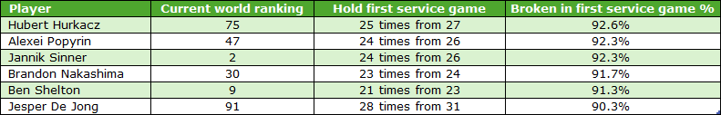 Hurkacz, Shelton and Popyrin are renowned strong servers so no surprises perhaps to see those three make this list. Sinner, of course, is an excellent server coupled with having a great all-court game.