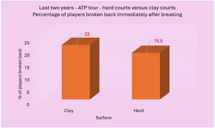 Another statistic that has a significant difference between hard and clay court numbers is the percentage of players immediately broken back after breaking themselves. I guess this should come as no surprise based on the fact that there are more breaks of serve in clay court matches than in hard court ones. Here is the breakdown: