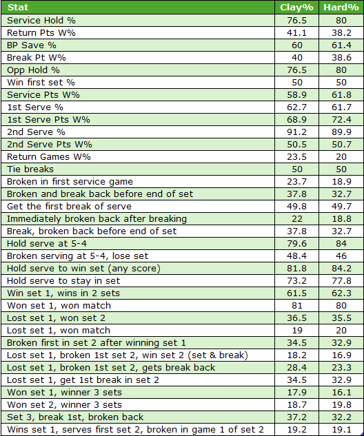 These stats have been taken from the Stats drop down menu on the site using the ’Metrics’ page. This page gives the figures for each individual surface one at a time, so for ease I have copied two pages, linked them together, so it is simpler to compare the two. Also, on that page you’ll find all the WTA stats across different surfaces as well as the Men’s Challenger, Men’s ITF, Women’s Challenger and Women’s ITF figures.