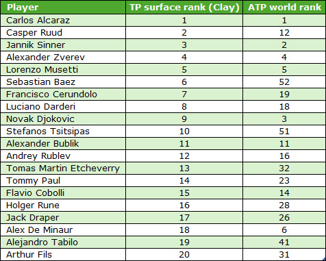 Below are the current top 20 TP Surface Rankings for clay courts, alongside the players’ current overall ATP world ranking.