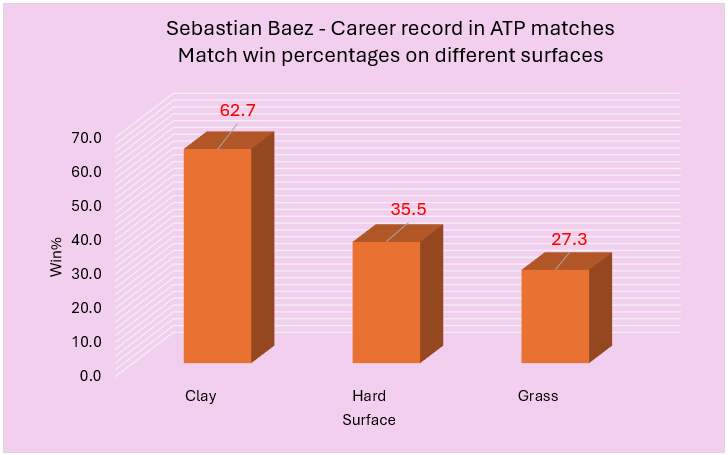 I think the graph explains it all. Sebastian Baez, like Ruud, is far better on this slower surface and his all-time splits are as follows: