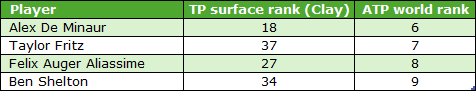 In terms of players who are less good on clay compared to hard or grass courts, there are four current top ten players that fall into that category – Alex De Minaur, Taylor Fritz, Felix Auger Aliassime and Ben Shelton. Firstly, let me compare their current ATP world rankings with their TP Clay Rankings:
